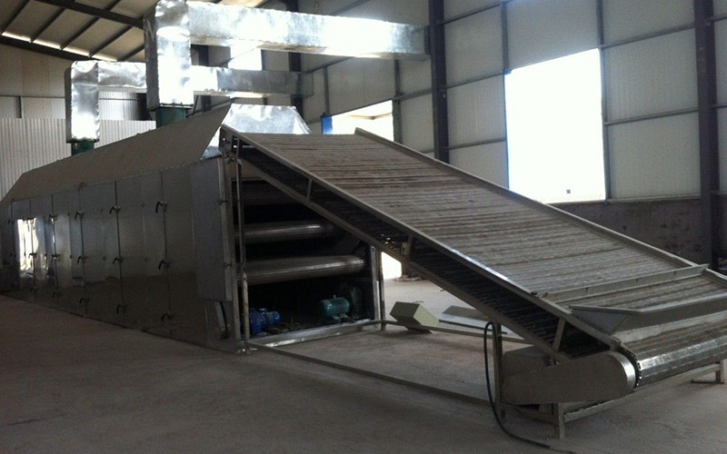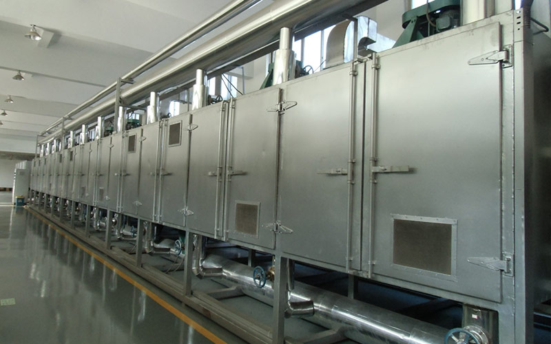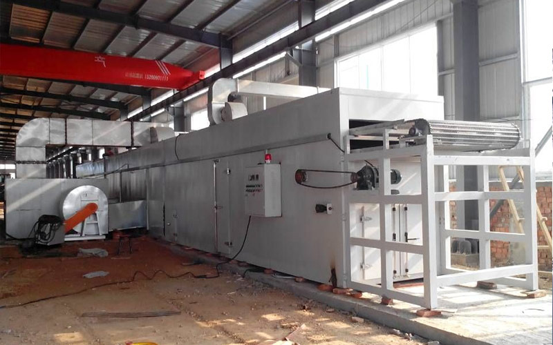 物料由加料器均匀地铺在网带上,网带一般采用12-60目不锈钢丝网,由传动装置拖动在干燥机内移动。干燥机由若干单元组成,每一单元热风独立循环,部分尾气由专门排湿风机排出,废气由调节阀控制,热气由下往上或由上往下穿过铺满物料的网带完成热量与质量传递的进程,带走物料水份。网带缓慢移动,运行速度可根据物料温度自由调节,干燥后的成品连续落入收料器中。上下循环单元根据用户需要可灵活配备,单元数量亦可根据需要选取