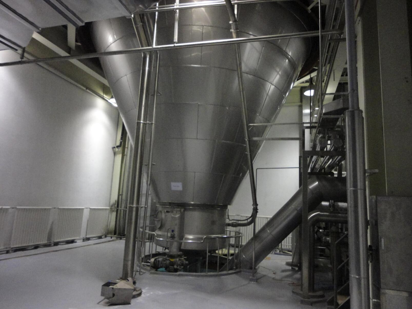 压力喷雾干燥机工作过程为:料液通过隔膜泵高压输入,喷出雾状液滴,然后同热空气并流下降,大部分粉粒由塔底排料口收集,废气及其微小粉末经旋风分离器分离,废气由抽风机排出,粉末由设在旋风分离器下的收粉筒收集,风机出口处还可装备二级除尘装置,回收率在96%-98%。