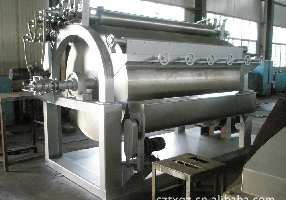 2 、操作弹性大,适用性广。可调整滚筒干燥机的诸多干燥因素。如进料的浓度、涂料料膜的厚度、加热介质的温度、滚筒的转动速度等,都可以改变滚筒干燥机的干燥效率,且诸多因素互无牵连。这给滚筒干燥操作带来很大的方便,使之能适应多种物料的干燥和不同产量的要求。